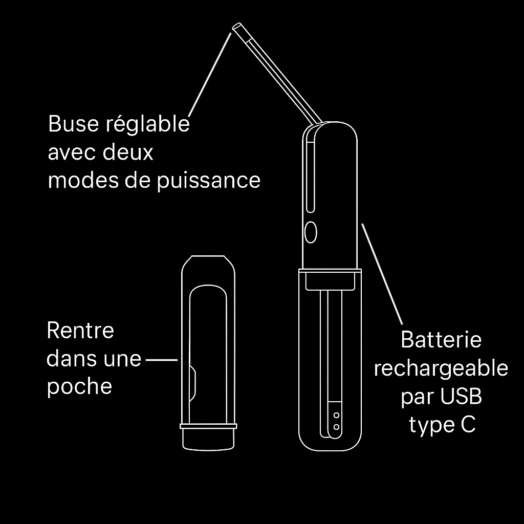 Avec ses dimensions de 21 cm de long et 5,5 cm de diamètre pour un poids de 300 g, ce modèle se transporte facilement dans un sac ou une trousse de voyage. Sa pompe interne assure une diffusion d’eau régulière et maîtrisée, et son réservoir peut être remplacé par une bouteille d’eau grâce à l’adaptateur inclus.