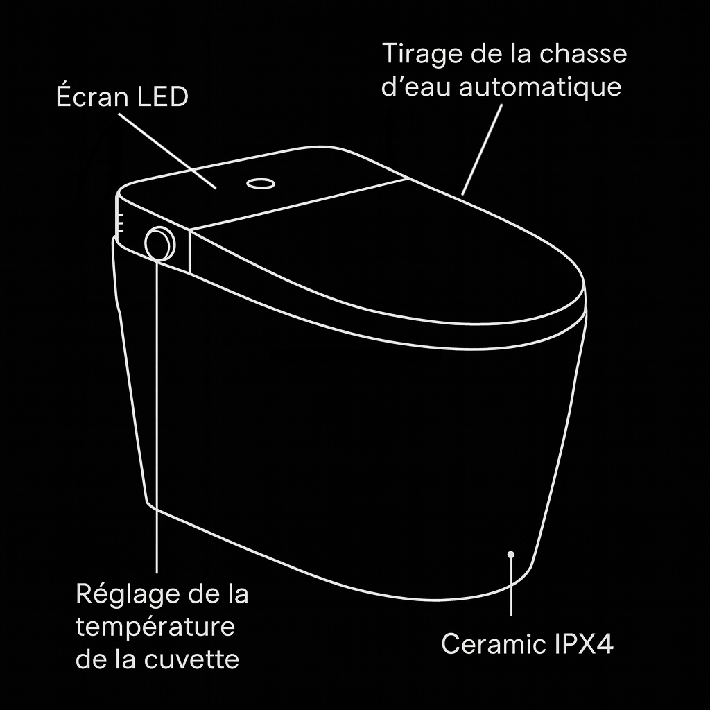 Le siège chauffant à quatre modes permet d’ajuster la température selon les préférences, depuis la télécommande ou l’écran LED intégré affichant toutes les informations essentielles : températures de l’eau, de l’air, de l’assise, puissance du jet et du séchage. Le système de nettoyage à jet d’eau propose plusieurs options : postérieur, zones intimes féminines, ainsi qu’un cycle d’auto-nettoyage.